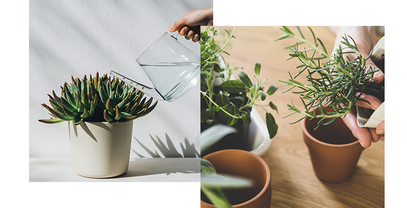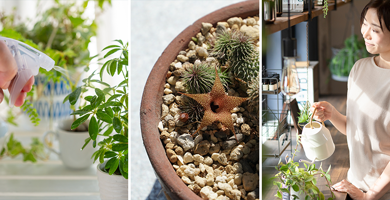 • 観葉植物 観葉植物の多くは熱帯性の植物であるため寒さが苦手。冬は休眠期に入ります。したがって、成長期より水を控え、土を触って乾いてから、さらに1〜2日おいてたっぷりと与えるのが基本です。肥料も必要としない場合がほとんどです。日中は暖かい窓際がベターですが、窓に近すぎると冷気が当たるので注意しましょう。 • 多肉植物 多くの耐寒温度は5度程度で、室内管理がおすすめです(暖房の直風は厳禁)。ただし、エケベリア属やセダム属、センベルビウム属などの「冬型多肉植物」は屋外でも管理可能です。