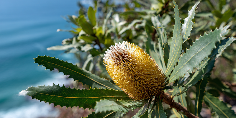 これらの難点をクリアし、海沿いの個性を最大限に生かす庭づくりのコツは、環境に合わせた植物選びと配置、そして土壌のチェックです。1. 個性を生かす植物選び 植物選びの基本は、耐塩性の高い植物を選ぶことです。自生種(マルバグミ、シャリンバイ、トベラ)など海辺に自然に生えている植物や、オーストラリア産のオージープランツ(ソルトブッシュ、コーストバンクシア)など乾燥地帯に生えている植物、地中海沿岸によく見られるシルバーリーフ類(ユーカリ、オリーブ)、常緑樹などが向いています。対照的に、落葉広葉樹など葉が薄い植物は塩によって水分が抜けやすく、ダメージを受けやすい傾向があります。