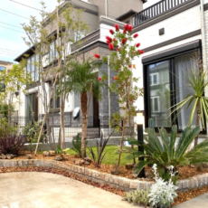 白い花壇とロッカリーで創る。水やりを抑えた都会的なリゾート植栽施工例