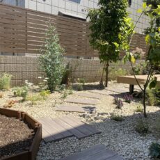 アルミ材フェンスで創る洗練されたプライベート空間。大理石の化粧砂利で足元まで美しく